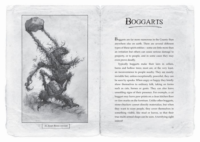 | Página retirada diretamente do Bestiário de John Gregory. Na imagem, uma subespécie de ogro: o taca-pedras. |